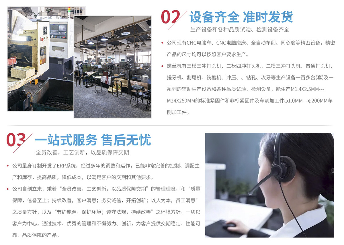 主要生產(chǎn)非標(biāo)件(止付螺絲、自攻牙螺絲、木牙螺絲、機(jī)械牙螺絲、加長(zhǎng)螺絲、高強(qiáng)度螺絲、螺桿、軸、銷等)和標(biāo)準(zhǔn)件(國(guó)標(biāo)、美標(biāo)、德標(biāo)、日標(biāo)、英標(biāo)等)。